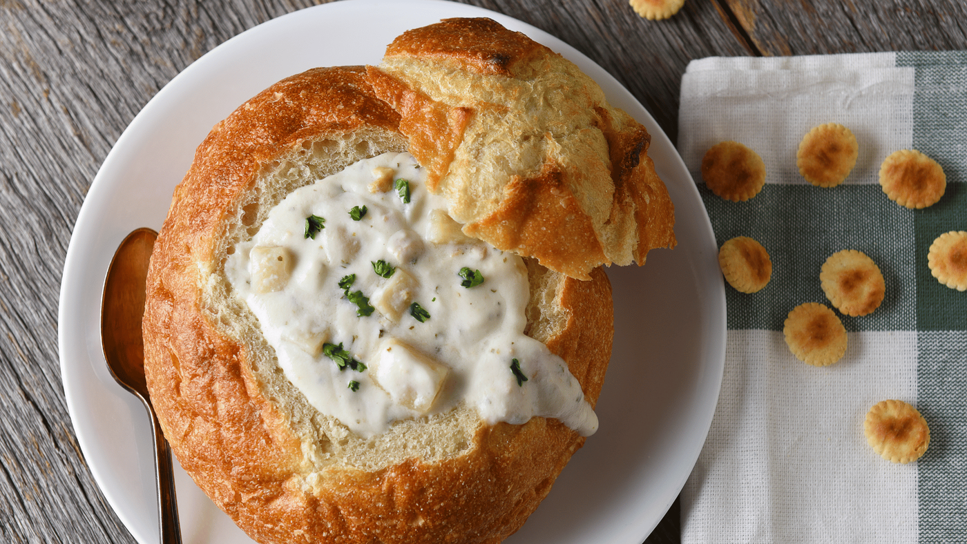 A New England régió híres tejszínes kagylóleveséről, amelyet gyakran kenyérbögrében szolgálnak fel.