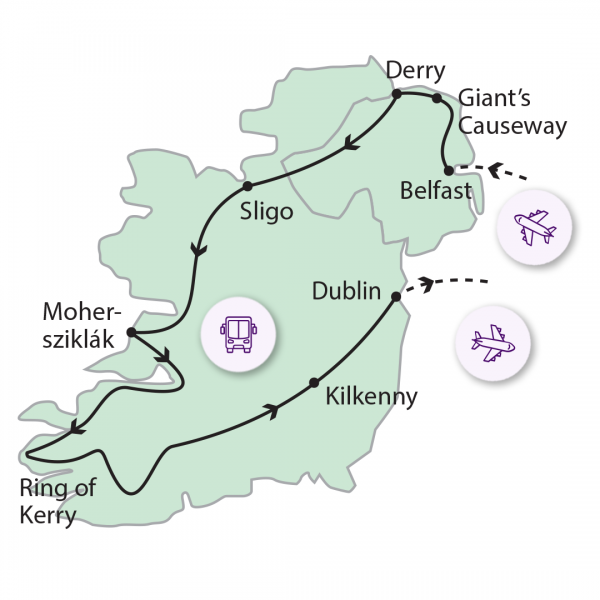 Utazás menetrend szerint a reggeli órákban az ír szigetre, ahonnan elindulunk a látnivalók felfedezésére. Belfastba érkezve buszos panoráma városnézésünk során megtekintjük többek között az impozáns Városházát, az Operaházat és a berlini fal belfasti alteregóját, a Békevonalat, mely még ma is áll, elválasztva egymástól a katolikus, valamint a protestáns városrészt. Ezután a kikötő felé vesszük az irányt, mely arról is híres, hogy több mint száz évvel ezelőtt itt épült a Titanic, amely 1912-ben Southamptonból indult első, s egyben utolsó útjára. A hajó rövid történetét bemutató látványos kiállításon megismerhetjük a hajógyárat, a hajó belsejét, a végzetes utazást a katasztrófáját, és annak utóéletét. Délután meglátogatunk egy whiskeylepárlót, ahol megismerkedhetünk a nemes nedű gyártási folyamatával és meg is kóstolhatjuk azt. Szállás Belfastban.