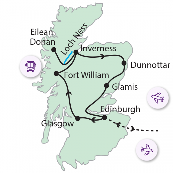 Ma először a festői Rogie Falls vízesésnél teszünk egy kis erdei sétát, majd a kietlen Felföldön, lélegzetelállító úton haladunk a Loch Carron mentén. A táj drámai szépségű: mély tavak, zöldellő hegyoldalak színesítik az utat. Ezután átkelünk a Skye szigetre egy magas hídon, ahonnan teljes panoráma nyílik a tengeröbölre. A szigetről visszatérve egy hajókirándulásra mehetünk, melynek során egy másik perspektívából is gyönyörködhetünk a látványban és szerencsés esetben fókákat, esetleg vidrákat is láthatunk. A déli órákban felkeressük a Hegylakó című filmből is híressé vált Eilean Donan Castle-t, amelyet Skócia leggyakrabban fotózott váraként tartanak számon. A szépséges Glen Shiel völgyön át visszatérünk a Loch Nesshez, ahol napi utolsó látványosságaképp megtekintjük Skócia talán legromantikusabb várkastélyának, az Urquhartnak romjait, ahonnan csodálatos a kilátás a környező hegyekre és a tóra. Talán felbukkan a messze földön híres szörny, Nessie is. Szállás, mint előző nap.